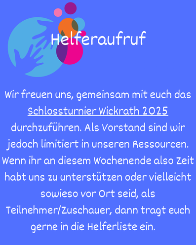 Um das Schlossturnier 2025 so gut wie möglich durchführen zu können, benötigen wir eure Unterstützung. Solltet ihr Zeit haben, dann tragt euch in die Helferliste ein und helft uns ein unvergessliches Wochenende zu haben.