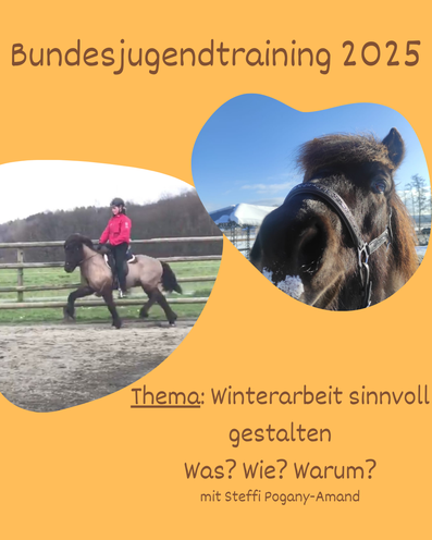 Hallo ich freue mich, dass das diesjährige Bundesjugentraining mit Steffi Pogany- Amand auf dem Islandpferdegestüt Töltmyllan stattfinden wird unter dem Motto: Winterarbeit sinnvoll gestalten, was wie warum?