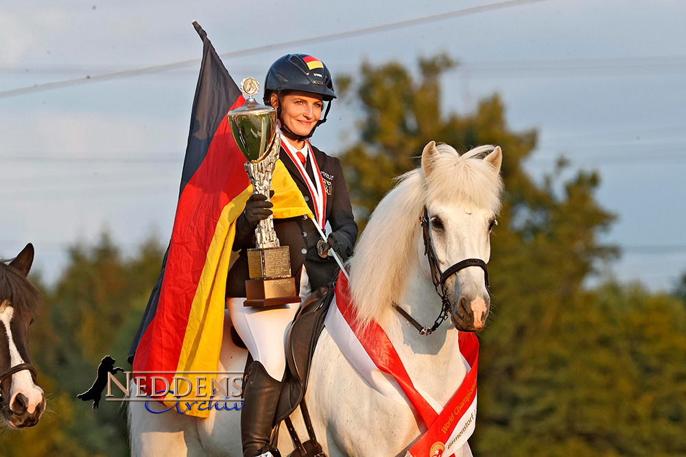 Wir gratulieren Laura Enderes und ihrem pfeilschnellen Fannar von der Elschenau zu ihrem Sieg bei der Weltmeisterschaft in der PP1. Wie immer zeigten die beiden einen harmonischen Auftritt in ihren 2 Passläufen. Nach ihrem Sieg bei den deutschen Meisterschaften kann auch bei den Weltmeisterschaften niemand dem Paar aus dem Rheinland die Stirn bieten. Mit einem Endergebnis von 8,92 Punkten blieben die beiden nur knapp hinter dem Ergebnis der DIM, aber deutlich vor den zweitplatzierten aus Island Hinrik Bragason und der drittplatzierten Ladina Sigurbjörnsson-Foppa aus der Schweiz.